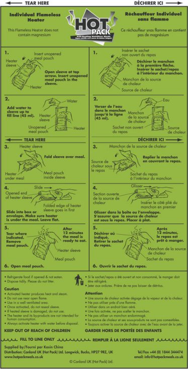 Met de verwarmingszak van 24 Hour Meals kun je je maaltijd zonder fornuis verwarmen – perfect voor onderweg. Voeg ongeveer 50 ml water toe om de zak te activeren. Voor het beste resultaat gebruik je lauw water en plaats je de zak uit de wind.