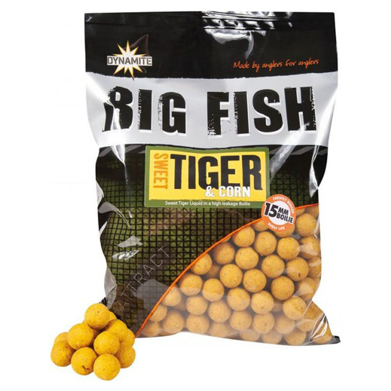 Dynamite Baits Big Fish Sweet Tiger & Corn Boilies 1,8kg, een fantastische aanvulling op onze Big Fish boilies. Gebaseerd op onze super populaire Sweet Tiger Liquid met de toegevoegde aantrekkingskracht van maïs. Een stevige textuur maar met een hoge lekkage, geschikt voor het voeren op afstand. Verkrijgbaar in 1kg, 1.8kg en 5kg zakken in 15 en 20mm (20mm maat is alleen export).