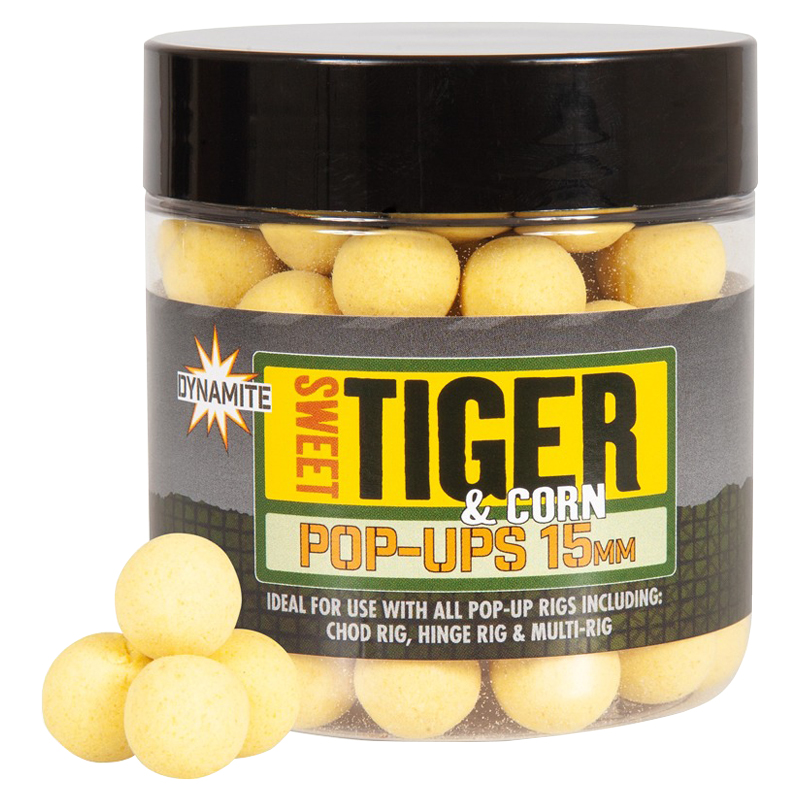 Dynamite Baits Big Fish Sweet Tiger & Corn Pop-ups 15mm - Een bijpassende pop-up voor de Big Fish Sweet Tiger en Corn boilie. Met maïs voor een natuurlijke vis-aantrekkende smaak. 15 mm groot. Dezelfde romige, zoete smaak als de boilie. Worden geleverd in hersluitbare potjes om de versheid te behouden.