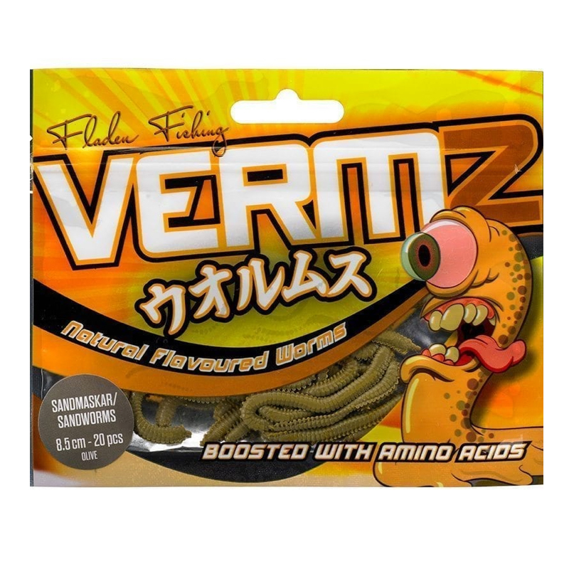 Fladen’s Vermz zijn imitaties van natuurlijke wormen. Ze zien er uit en ruiken/smaakt net als natuurlijke wormen, en zijn versterkt met natuurlijke aminozuren. De aardwormen zijn het perfecte aas voor de meeste soorten. Bloedwormen, d.w.z. de larven van niet bijtende muggen, zijn ook perfect voor de meeste soorten, en doen het bijzonder goed bij bijvoorbeeld het wintervissen op baars en wildvis. Fladen’s Vermz Sandworm is een perfecte imitatie van een zandworm of wadpier van de familie, Polychaete. Het ziet eruit en ruikt/smaakt als een echte zandworm. Perfect voor het bodemvissen op de meeste vissoorten, en gemonteerd op een jigkop of jig.