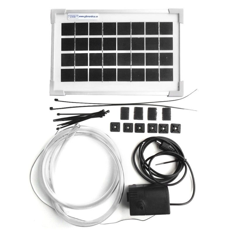 De zon drijft automatische bootafvoer aan met de zonne-lenspomp. Capaciteit: 225 l/uur, perfect voor tot 100 mm regen per maand.