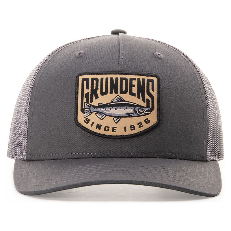 Grundéns King Trucker Charcoal - Klassieke, mid-crown trucker pet met een verstelbare snapback sluiting. Met een opvallend Grundéns King Salmon-ontwerp op een authentieke Richardson pet.