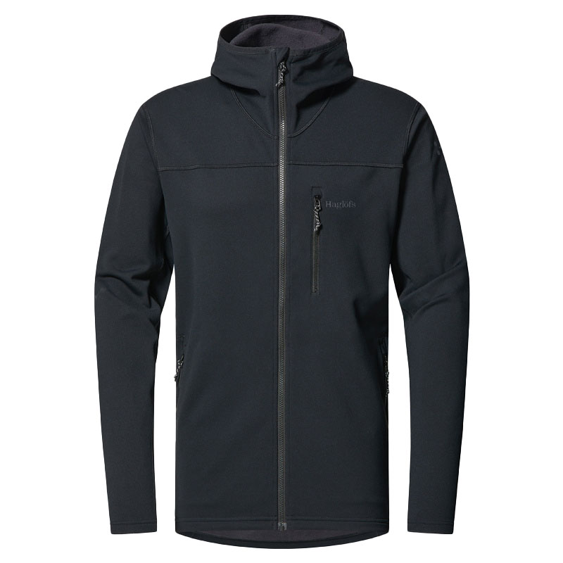 Haglöfs Rosson Mid Hood Men True Black - Een stijlvol en zacht mid-layer jack voor wandelen en buitenactiviteiten. Het is ontworpen als veelzijdige basislaag voor je outdooruitrusting. Draag het alleen of in laagjes.