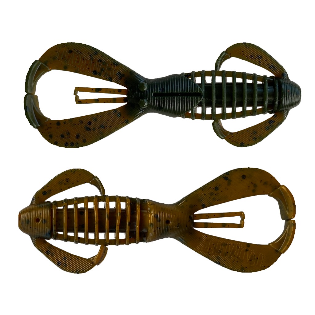 De BangerBug is veelzijdig te riggen, maar komt echt tot leven op een Headbanger RockerHead. Zo ontstaat een zeer natuurgetrouwe kreeftimitatie die over stenen, hout en andere structuren stuitert. De uitsparing op de rug verbergt de haakpunt van de RockerHead, wat de kans op vastlopen verkleint en de softbait langer heel laat. Twee subtiele puntjes op de buik geven precies aan waar de haak erin en eruit moet komen, zodat een strak en recht riggen eenvoudig wordt. De kleine maat combineert perfect met een #3/0 RockerHead, de grotere met een #4/0.