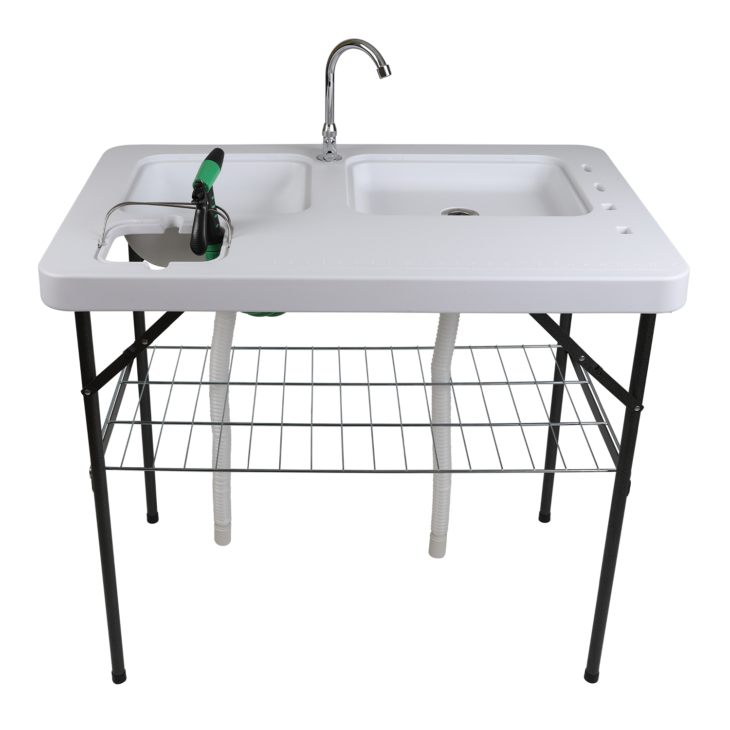 Het IFISH Arbetsbord is uw ideale metgezel voor vistrips en biedt een stevig, inklapbaar werkstation dat perfect is voor het schoonmaken van uw vangst of kookavonturen in de buitenlucht. Deze tafel is gemaakt van duurzaam plastic en heeft twee ruime gootstenen met deksels, een praktische kraan en een slang met een handige Gardena koppeling voor een naadloze watertoevoer. Bovendien biedt de handige plank eronder extra opbergruimte voor al je visspullen of kookbenodigdheden. Of je nu verse vis bereidt aan de oever van de rivier of een feestmaal bereidt in je buitenkeuken, deze tafel van 100 cm bij 65 cm bij 90 cm verbetert je buitenervaring.