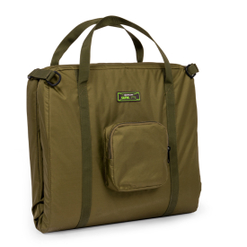 Aan de achterzijde van de mat zit een specimen weigh sling, netjes opgeborgen in een compact tasje. Dit tasje is zo vormgegeven dat Korum scales er ook in passen, zodat alles bij elkaar blijft. De mat klikt stevig dicht en heeft een geïntegreerd handvat voor makkelijk dragen. Zo blijft de uitrusting licht en overzichtelijk, zonder concessies aan visveiligheid.
