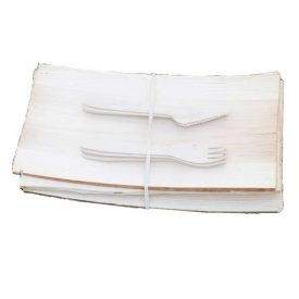 4 borden met houten bestek, 4 messen en vorken. 8 stuks bestek.