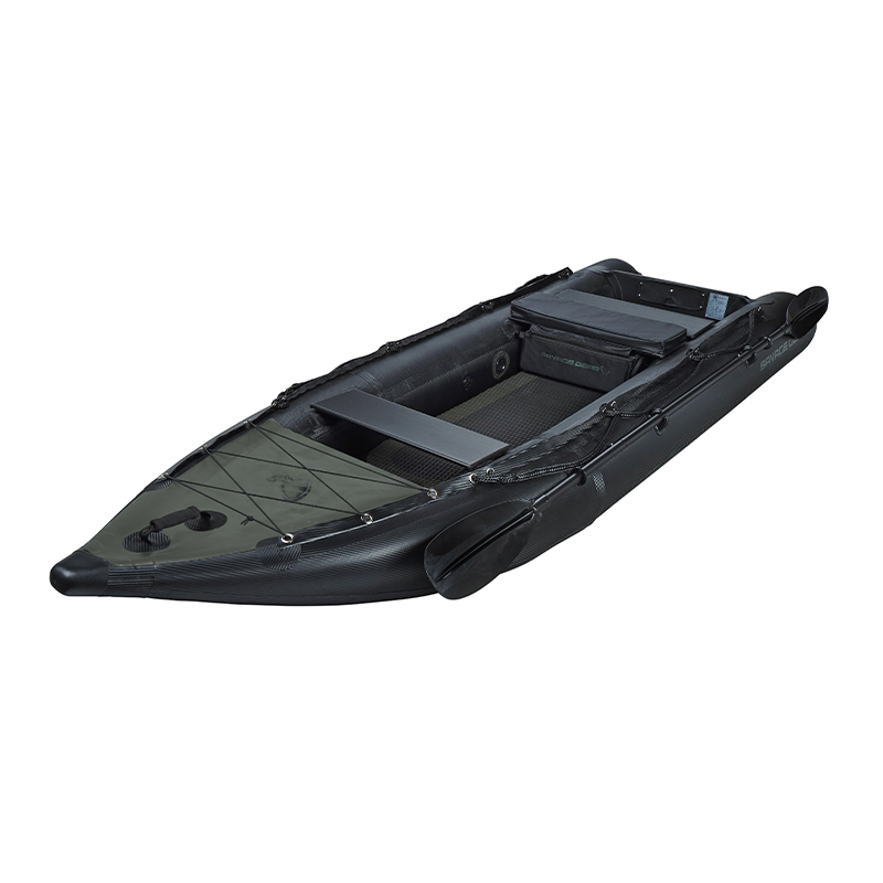 De kayak is geschikt voor elektromotoren tot 55lb thrust (2PK), waardoor je gecontroleerd kunt slepen of werpen zonder de stek te verstoren. De 0,90 mm dikke, geweven carbon optics PVC-constructie in combinatie met de opblaasbare drop stitch vloer zorgt voor een stijve en robuuste basis tijdens het vissen.