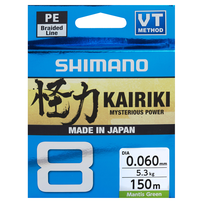 De nieuwe Shimano Kairiki 8 is een vernieuwde 8 drager vlecht die geproduceerd wordt in Japan en nu voorzien is van een “VT construction Method” vlechttechnologie. Het is een zeer sterke en soepele PE lijn die perfect is voor het werpen van grote afstanden. Hij is verkrijgbaar in diameters van 0,06 mm tot 0,42 mm met een verbluffende breeksterkte van 46,7 kg. Het heeft de perfecte eigenschappen voor het spinnen in zowel zoet als zout water omdat het zeer gevoelig en zeer glad is, wat ook resulteert in geluidsreductie. Ook komen er naast de Mantis Green en Steel Grey twee extra kleuren beschikbaar, namelijk een goed zichtbare Yellow en Multi Color. De Multi Color is vooral interessant voor het vissen op grotere diepte. Door de soepelheid en de lage diameter is de Kairiki 8 een uitstekende lijn voor het jiggen, aangezien deze lijn een lage waterweerstand heeft en door de maximale rek van < 3,0 % ook zeer gevoelig is.