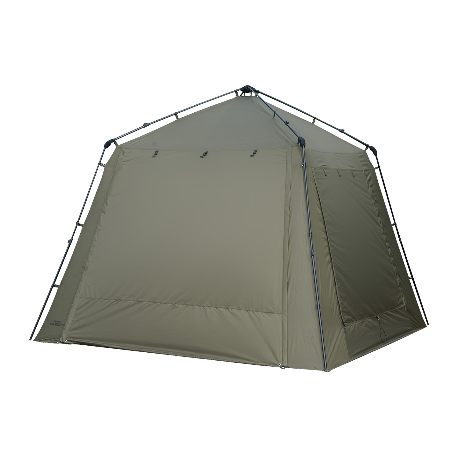 Voor warmere dagen kies je tussen een groen frontpaneel of mozzie mesh deur en gebruik je de twee grote zijventilatieopeningen voor extra luchtcirculatie zonder last van muggen. Achterin zit een ritspaneel voor achteringang of koppeling met andere shelters. Binnenin zitten twee opbergvakken voor hoofdlamp, receiver of klein materiaal.