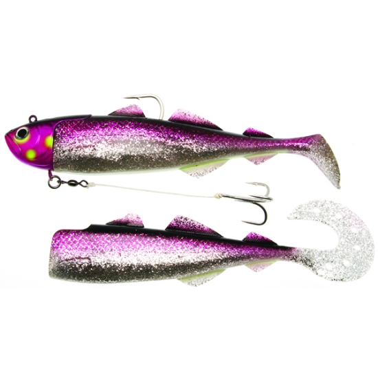 Ze heeft een waanzinnig sexy beweging en zwempatroon - zelfs langzaam gevist - gebaseerd op jonge koolvis - het favoriete hapje voor de grote trofeeën die jagen op de zeeën en kusten rond Noorwegen. We hebben twee verschillende lichamen - de krulstaart voor een soepele, wormachtige zwemactie (zelfs op de langzaamste snelheid) - en de schoepstaart voor die ""neem-me-nu"" gewonde-paniekachtige-vis-actie. We hebben de beweging jarenlang getest en geperfectioneerd, waarbij we elke mogelijke verandering in vorm, grootte en gewichtsverdeling hebben uitgeprobeerd. De ervaren gidsen van de Noordse zeevisserij die hem getest hebben, vinden dat we in onze opzet geslaagd zijn - en sommige buitengewoon grote vissen zijn het daarmee eens!